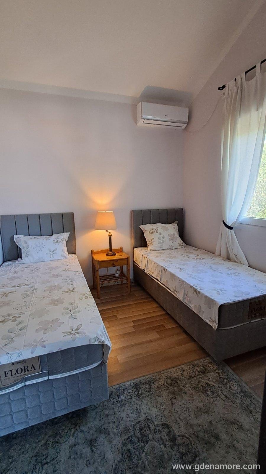Sastoji se od 2 spavaće sobe sa klima uredjajima, prostrane dnevne sobe, potpuno opremljenom kuhinjom (sa svim potrebnim sudovima, mašinom za sudove, mikrotalasnom), kupatilom sa tus kabinom i prostranom terasom sa koje se pruza predivnan pogled na ceo Boko-Kotorski zaliv. Privatan parking u okviru kuće je obezbeđen. Kuca je udaljena 100m od uređene čiste plaže. U blizini je poznata pescana plaža Przno "Plavi Horizonti", Lustica Bay, 12km do Tivta, Porto Montenegra, 8km do Kotora, i Tivatskog aerodroma. Autobuska stanica na 100m. Izlet brodom do Herceg Novog, Žanjica i Plave špilje.